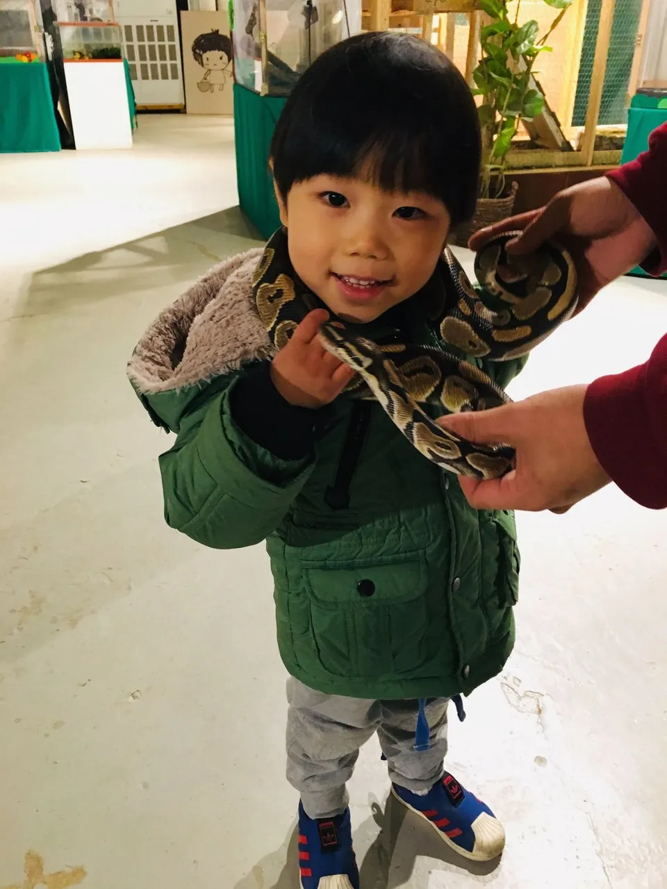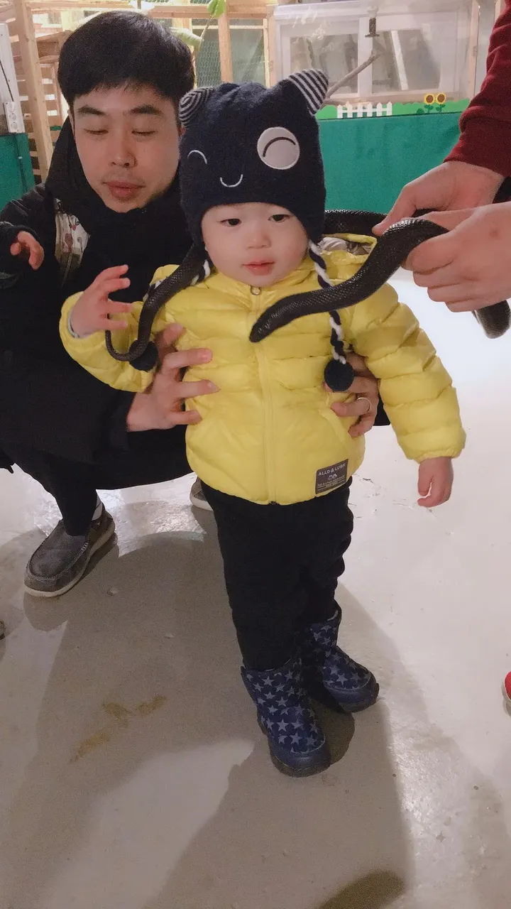 그리고 저희 첫째 역시 처음에는 무서워하다가 뱀을 한 번 만져보더니 뱀의 매력에 완전 빠져버려서 저보다 더 적극적으로 다가가더라구요. 나중에는 우리 안에 들어가겠다는 걸 말리느라 고생을 조금 했습니다 ㅋㅋㅋ