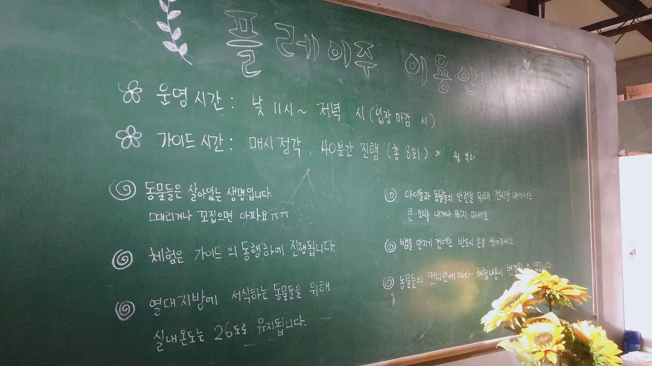 '플레이주'는 '주렁주렁'과 마찬가지로 실내 동물원입니다. 사실 동물원이라고 표현하기에는 규모가 너무 작긴 하지만 상주하고 계시는 선생님께서 매 시간마다 동물들에 대한 설명과 체험을 진행하셔서 입장료(할인 적용 시 7,500원/인당)가 전혀 아깝지 않은 곳입니다. 가로세로 20m*10m(약 60평) 정도의 작은 규모이며 가설용 컨테이너로 지어진 허름한 외형에다 실내는 동물들 냄새로 약간 불편함이 있을 수도 있으니 참고해주세요~!