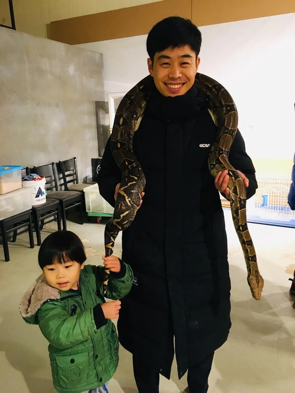제일 크기가 큰 보아뱀입니다. 어린왕자가 코끼리를 삼켰다고 생각할만큼 크지는 않지만 상당한 크기를 자랑합니다. 만약 목도리로 사용한다면 4인 가족도 거뜬할 정도입니다. 평소와 같이 해맑게 웃고(?) 있는 저의 표정이 보이시나요?ㅎㅎ 저 사실 이자리를 빌어서 반성하지만 뱀에 대한 오해와 편견을 가지고 있었습니다. 뱀들은 변온동물이라는 사실과 동화에 나오는 이미지 때문에 그런지 상당히 차갑고 냉혈하게 생각했었는데요. 제 생각과는 다르게 너무나 부드럽고 따뜻해서 깜짝 놀랐습니다. 순면 100%보다 더 보드랍고 따뜻해서 놓아주기 싫을 정도였어요. 그동안 뱀에 대한 오해를 한 번에 날릴 수 있었고, 인간관계에서도 제가 오해와 편견을 가지고 있는 부분에 대해서도 같이 반성해 보았습니다 ㅠㅠ