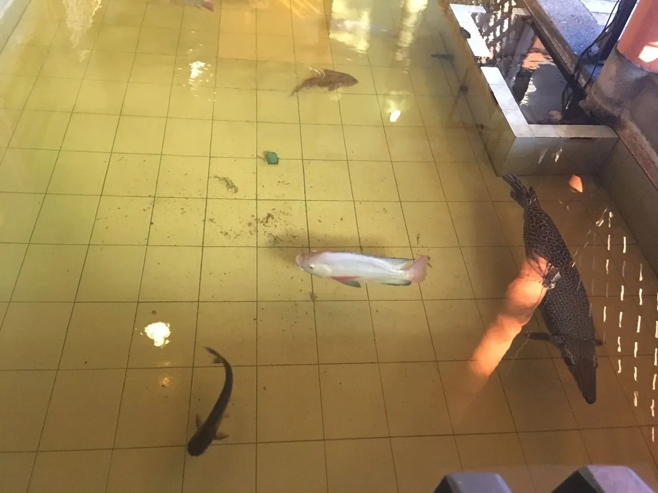 약속시간이 남아있었기 때문에 식당을 천천히 둘러보는데 판매용이 아닌 반려어를 키우는 느낌의 연못(태국에는 가정집마다 작은 어항에라도 물고기를 많이 키우는 듯 합니다)에 물고기들과 거북이가 상당히 많이 있었습니다. 아이들은 언제나 생물들을 사랑하는 법. 시간 가는 줄 모르며 물고기들을 구경하면서 첫째가 몇몇 물고기들에게 이름을 붙혀줬어요. 그리고 나중에 작은 삼촌(수수님)을 끌고 다니며 물고기 친구들을 소개 시켜주었습니다. 아이들이 수수님을 상당히 좋아하고 잘 따라서 밥 먹는 중간중간 수수님께 달라붙어서 식사를 제대로 즐기시지 못하신 것 같아 죄송스러운 마음이 들기도 했지만, 수수님의 아이들에 대한 순수한 애정이 고스란히 느껴져서 고마운 마음이 더 컸었습니다~^^