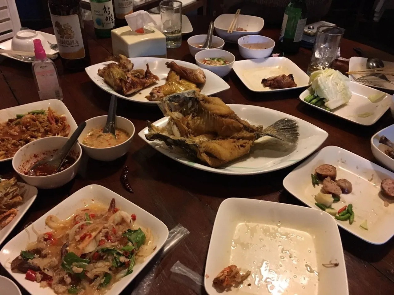 잠시 후 약속시간에 맞춰 히마판님과 수수님께서 도착하셨어요! 푸근한 인상과 다정하게 맞이해 주시는 모습에 마치 부처님 두 분을 영접한 기분이 들었습니다. ^^ 예약해 놓은 자리로 들어가서 음식을 주문하기도 전에 히마판님께서 슬며시 가방에서 무언가를 꺼내시더라구요. 바로 소주 두 병!! ㅋㅋㅋㅋㅋ 역시 한국 사람의 모임에서는 소주가 함께 해야죠!! ㅋㅋㅋ 태국에서는 한국에서와 다르게 맥주를 얼음을 타서 마시는게 일반적이더라구요. 얼음을 넣은 잔에 태국 맥주와 더불어 소맥을 제조해서 엄청나게 마셨는데 한국에서 먹는 소맥보다 몇 배는 더 맛있었습니다~!! 그래서 정신없이 마시다가 숙소가서 바로 뻗은;;; 이어서 음식을 주문하기 시작하셨는데 정말 끝도 없이 음식이 나왔습니다!! 엄청나게 많은 양의 음식을 주문하였지만 음식 하나하나가 어찌나 맛있던지 남기지 않고 싹싹 긁어 먹었어요. ^^ 덕분에 아내님은 2kg이나 쪘습니다 ㅋㅋ 한청 먹는 와중에도 중간중간 더 먹고 싶은게 없냐고 계속해서 신경써주시는 히마판님이 큰형님처럼 다정하게 느껴졌습니다~^^