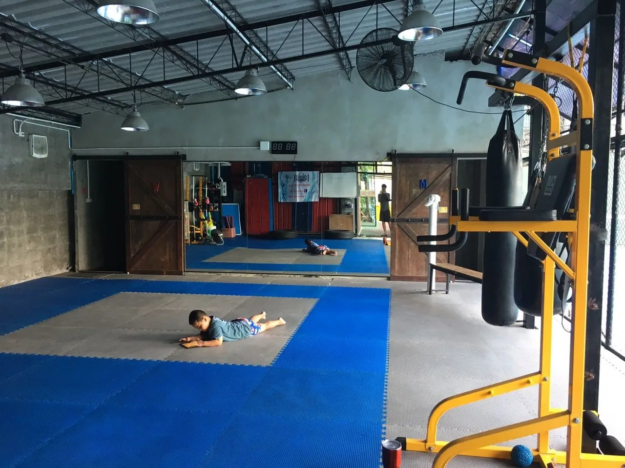 안으로 들어가니 일단 체육관은 맞어. 샌드백 있구, 헤드기어, 글러브, 킥 미트, 기타 운동기구 등등 다 있네. 근데 운동하는 사람은 안보이고 무에타이 꿈나무만 바닥에 엎드려서 핸드폰을 하고 있네...ㅠㅠ 안에서 사진 찍고 기웃기웃 하니까 키가 190cm는 되어 보이는 분이 다가오더라고. 순간 움찔함;;; 태국 분들 보통 키가 나랑 비슷했었는데 갑자기 키 큰 분이 훅 들어와서리 ㅎㅎ 영어 할줄 아냐고 물으니 나보다 더 잘하더라. 머쓱;; ㅋㅋㅋ 혹시 무에타이 배울 수 없냐고 물으니까
