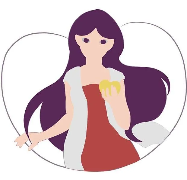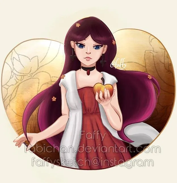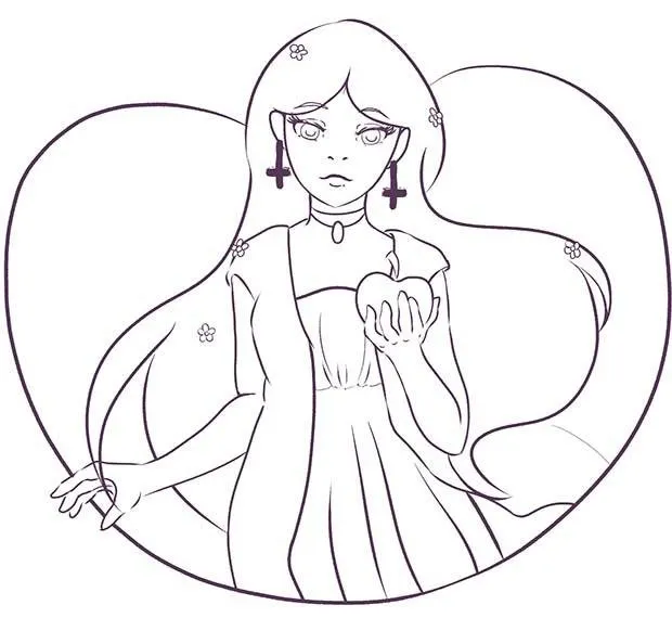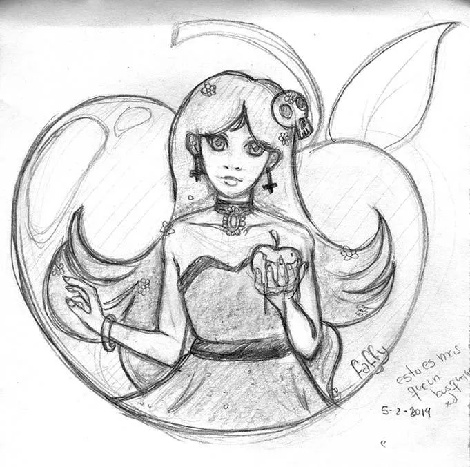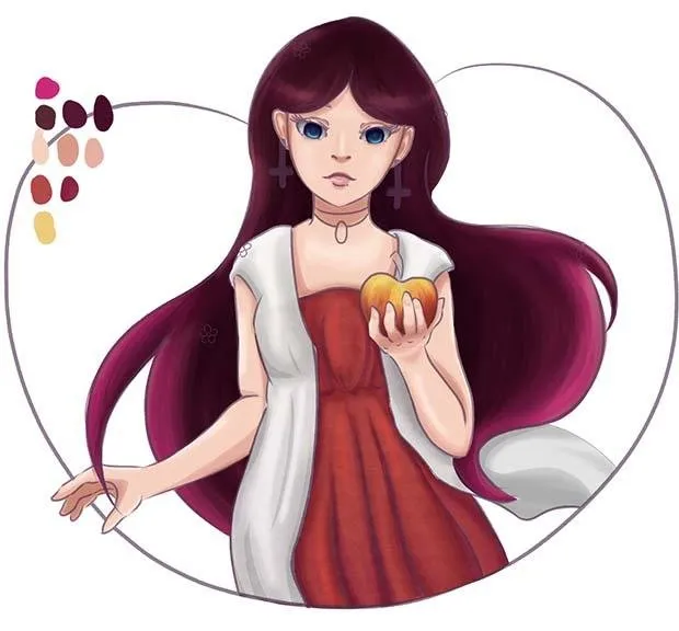 Cuando re hice el bosquejo en el nuevo programa, le cambié varias cosas. Se supone que en un principio usaba ropa oscura, debía usar un vestido estilo lolita-goth y accesorios góticos con encaje y de esas cosas complicadas de dibujar, la manzana debía estar envenenada, tenía que lucir todo simétrico y otras cosas más.