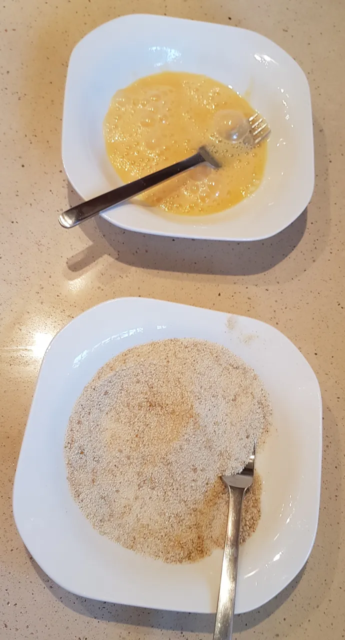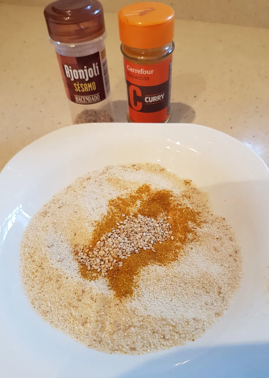 Batimos un huevo en un plato y le añadimos un poco de sal al gusto.En otro plato ponemos pan rallado con especia de curry y ajonjolí.