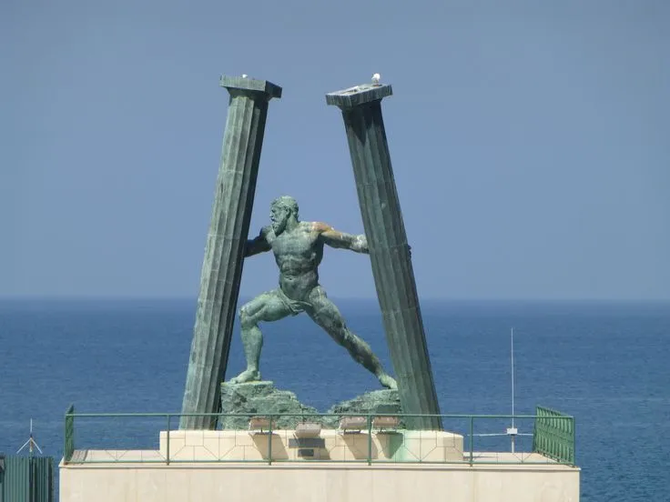 Well these pillars on the coin refer to 'the pillars of Hercules', pillars you had to cross when you enter the Mare Nostrum (Mediterranean Sea). One pillar in nowadays Rock of Gibraltar (north) and one on the Rock of Abila (Ceuta) (south). They are well apart but still it was believed Hercules had written on them : do not tresspass!