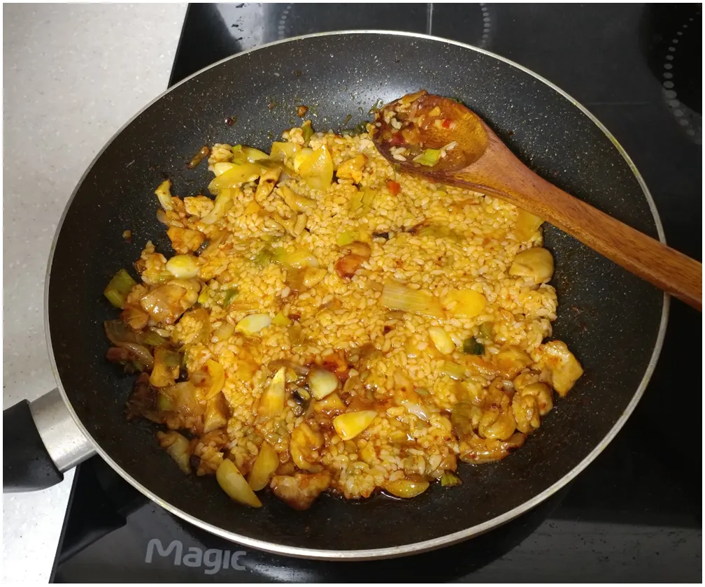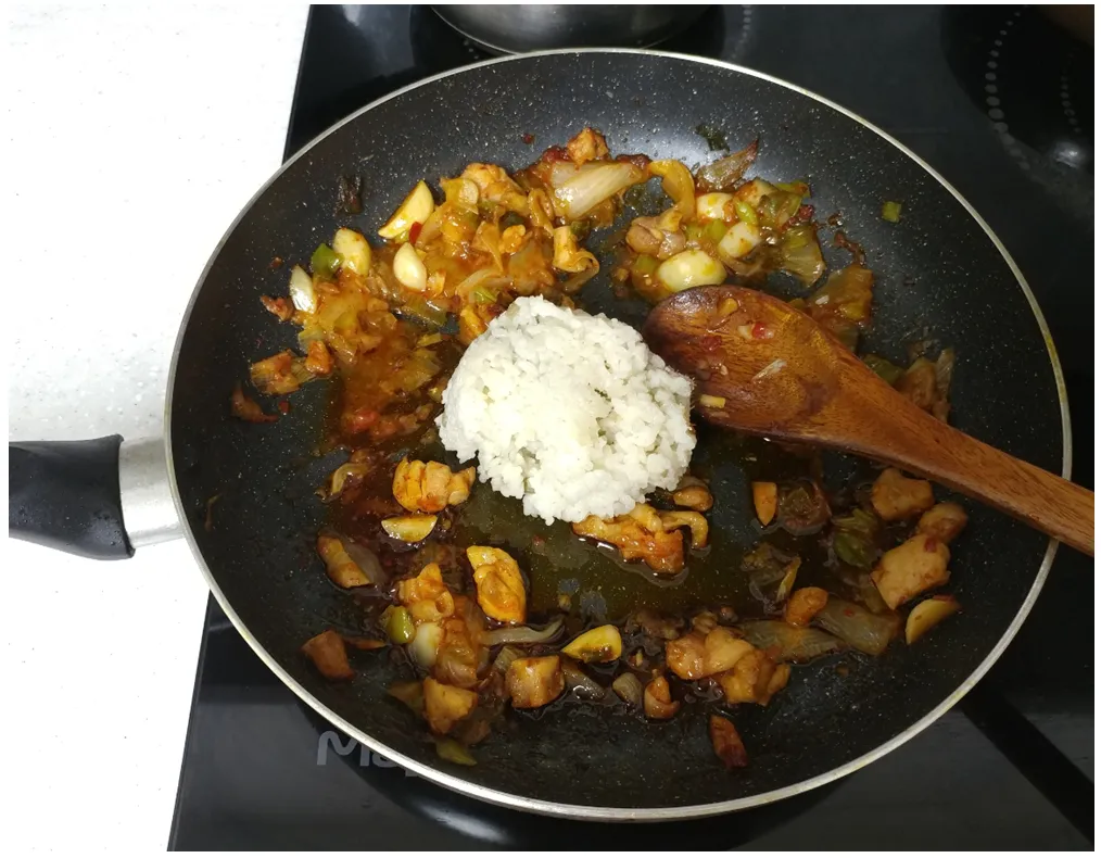 조금 남겨두고 다시 불에 올리고 밥 투하!!
