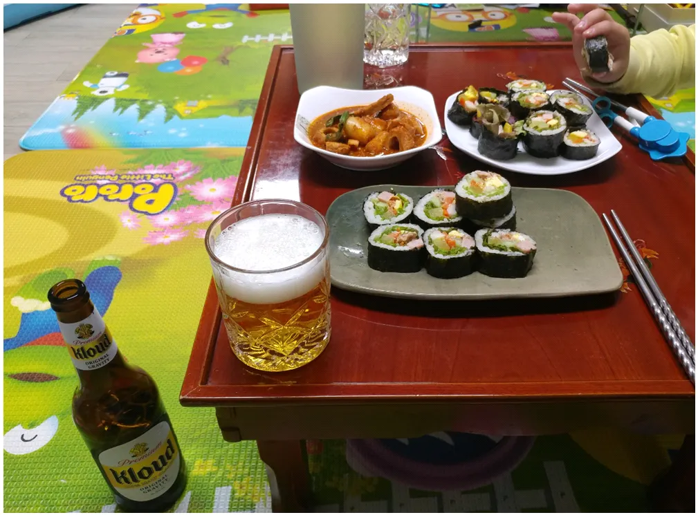 김밥에 떡볶이 먹으며 시원하게 맥주 한잔!!! 마시며 할리갈리 패배의 갈증을 달래었네요.