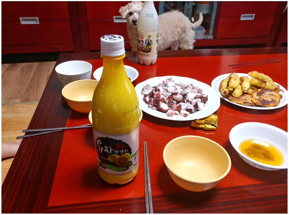 먼저 완전 색다롭게 처음 마셔보는 유자 막걸리로 술판이 시작되었답니다!!
