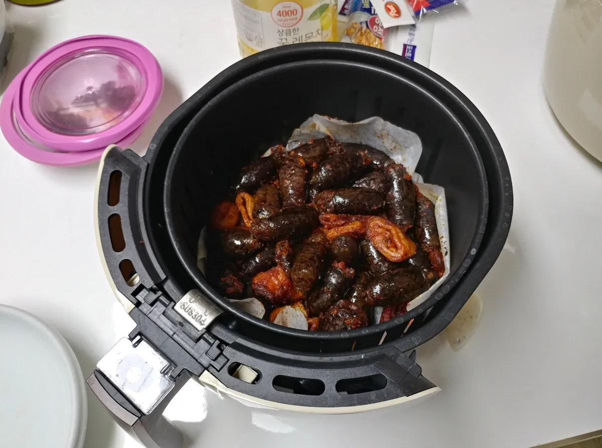 막걸리 안주로 순대와 막창을 에어 후라이어에 넣고 돌려보았습니다.