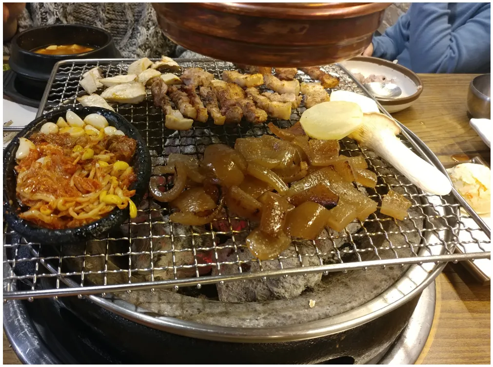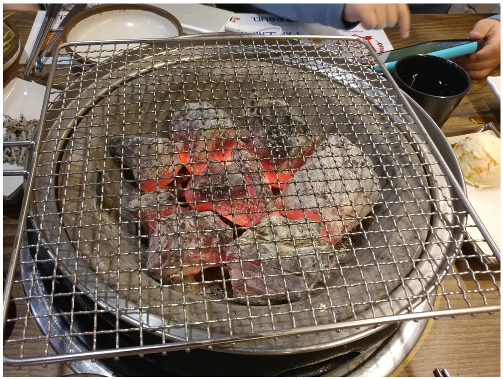 드디어 숯불위에 돼지 껍데기가 올라갔습니다!!