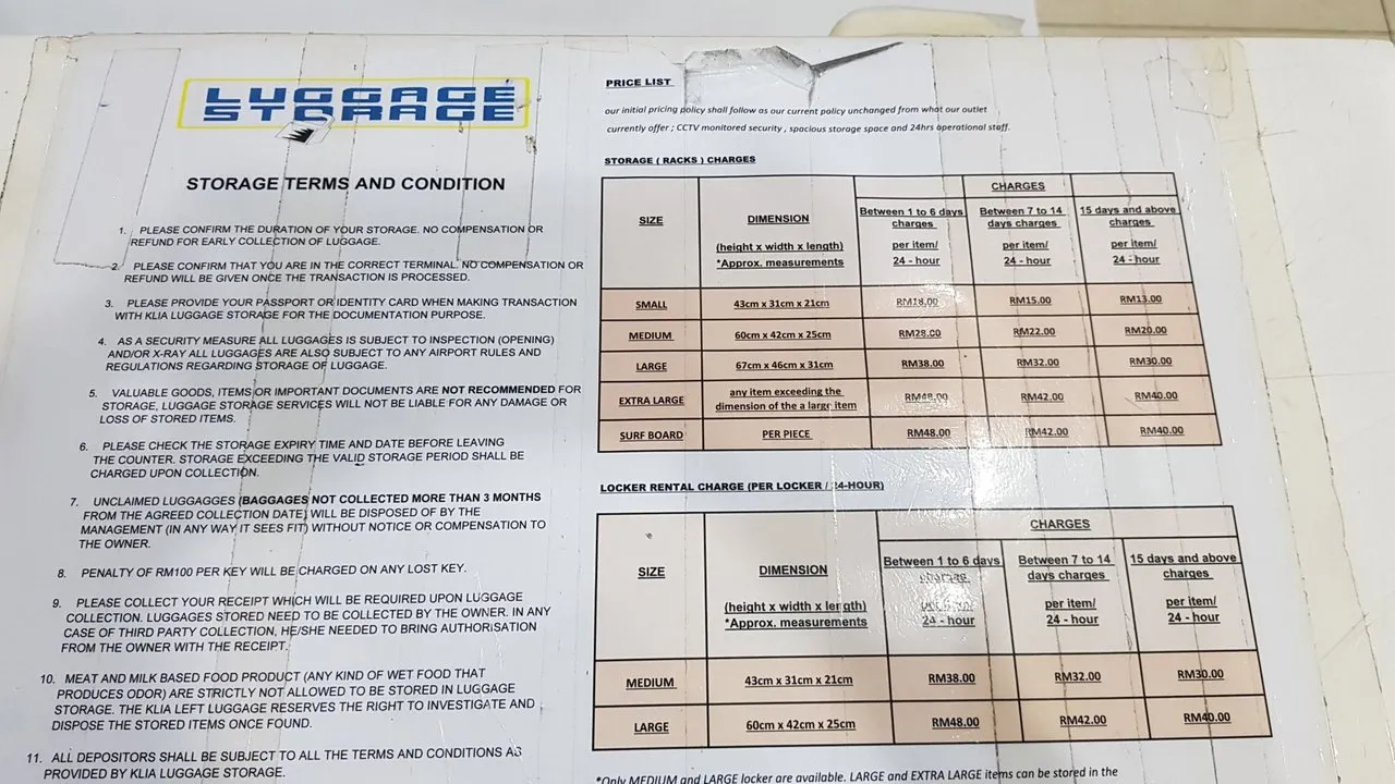 방콕 이미그레이션까지 짐가지고 왔다갔다 힘들것 같아서 쿠알라룸프 도착해서 짐을 맡기고 이동 하는걸로 했습니다. 말레이시아 공항은 입구에서 부터 가방 무게를 전원 재야해서 귀찮키도 하고... 그냥 짐을 맡기기로 했습니다. 짐 맡기는곳을 인터넷으로 찾다가 포기하고 물어물어 찾아갔습니다. 공항 쇼핑몰에 연결된 AIRPORT HOTEL 로비 옆으로 보면 파랗고 노란 간판에 유료로 짐맡기는곳이 있습니다. 당일 맡기기에는 조금 비싼 기분이었습니다. 최소 단위가 1-6일이었습니다 ㅠㅠ ( 가격표 참고하실수 있게 아래 사진으로 첨부했습니다) 베낭여행 오래 하시는분들이거나, 잠깐 이동했다 오시분들 사용하시기 좋은것 같습니다.