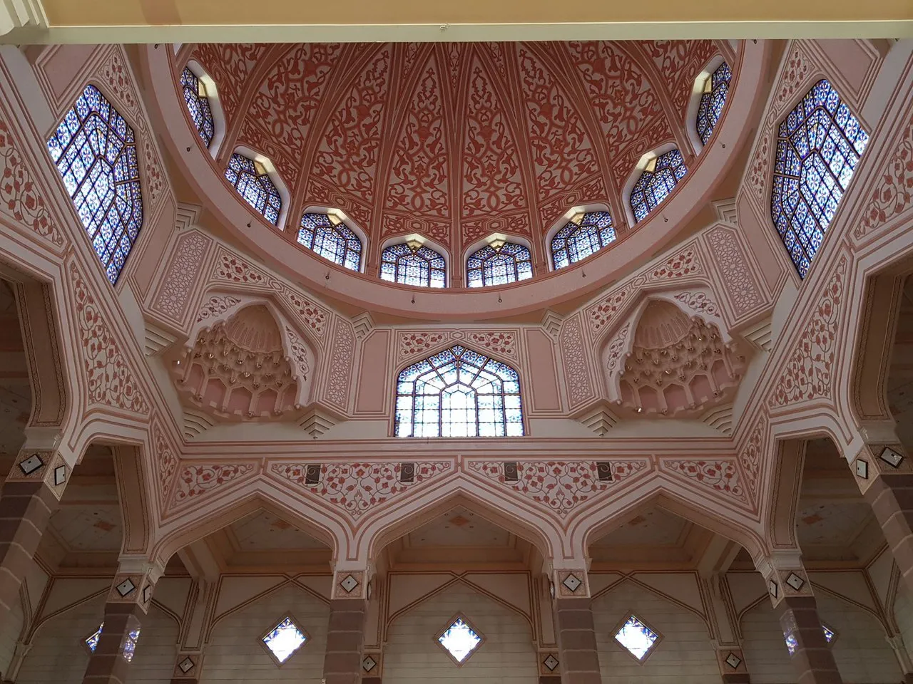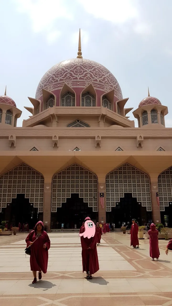 핑크모스크라 불리우는 곳의 원래 명칭은 푸트라 모스크(Putra Mosque)라고 합니다. 보통 하얀 모스크만 보다 핑크모스크를 보니 되게 신기하더라구요~ 이슬람 사원인 만큼 내부로 들어가는건 엄격해서 모자달린 빨간 망토를 입고 들어가야합니다. 동생은 해리포터 같다며 엄청 좋아하네요~ 더운나라에 남들이 다 같이 입는옷에 모자까지 써야 한다는것 때문에 마음에 안 내켜 저번에도 들어가지 않았는데, 동생이 좋아하니 이번엔 같이 들어갔습니다. 밖에는 찌는듯한 더위에 눈뜨기 힘들었는데, 보통 동남아 사원들처럼 안쪽으로 들어가면 따로 에어컨없이도 서늘합니다. 엄청 웅장하고 정교해서 눈을 떼지 못하겠더라구요~~ 핑크대리석 모스크여서 그런지 왠지 더 부드러운 빛이 들어오는것 같기도 하고, 믿지는 않아도 어떤 사원이든 들어가면 뭔가 묘한 기분이 들고 경건함이 생기는것 같습니다. 괜히 반성해야할것 같고;;;
