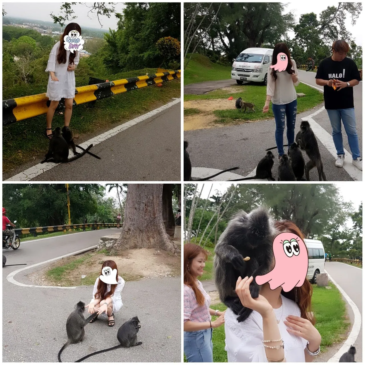 물론 제동생은 제 땅콩까지 다 가져다 주고 쬐그만하니까 검은 원숭이들도 만만했는지 동생 티도 잡고 주머니도 잡고 ㅋㅋㅋㅋ 지금 동생님 사진 보니까 한손은 피고 한손은 먹이주먹 쥐고 있으니 원숭이들이 졸졸 따라다녔나 봅니다. 첫번째 사진은 구석까지 몰려서 원숭이들한테 삥 뜯기는거 같네요 ㅋ 다른사진은 동생님의 사회적 체면도 있고 하니~~ 사진에 보이는것처럼 순하고 말을 잘 듣는 편이었습니다. 제가 원래 겁이 많기도 하고 또 원숭이들이 너무 많아지니까 차 주변에서 못 떠나고 있었더니 가이드가 좀 챙겨주셨습니다. 손님들 어깨에 원숭이도 올려주시구요~ 어깨로 다치지 않고 자연스럽게 올라가게 하는 방법이 있더라구요~