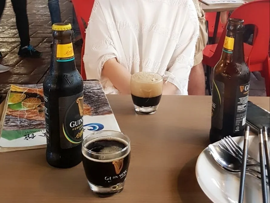 내일은 트윈타워 근처호텔로 이동하기 때문에 지친몸이지만 야시장 분위기도 느끼고 어제 못 먹었던 음식들도 시키키고 하고 어제부터 오늘까지 우리만 보면 친근하게 아무말이나 막 걸었던 호객행위 1위 식당에서 짜장면 같은 면과 귀여운 기네스잔에 기네스와 함께 밤을 보냈습니다. 사람들 구경 하러 앉긴 했는데 빨간 플라스틱의자에서 완전 정신 빠지는줄 알았습니다. ㅋㅋㅋㅋ