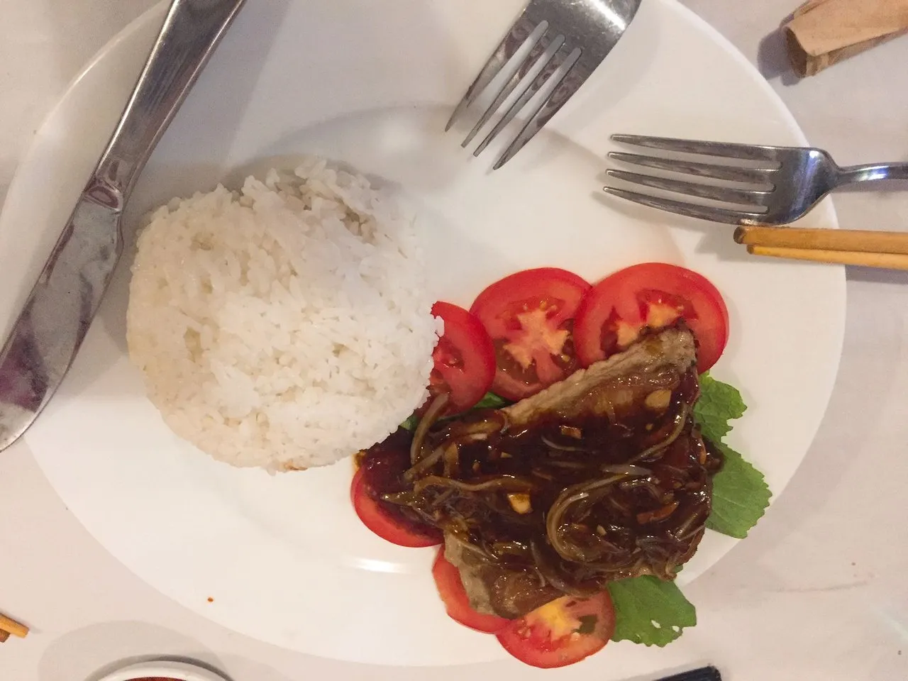 (Grilled pork with BBQ sauce 80,000 vnd -> 4400원 정도 - 야채볶음을 시켰으나 고기가 왔으니, 아쉬운대로 밥하고 조금 먹었습니다. 비비큐소스 그맛입니다 ^^ )