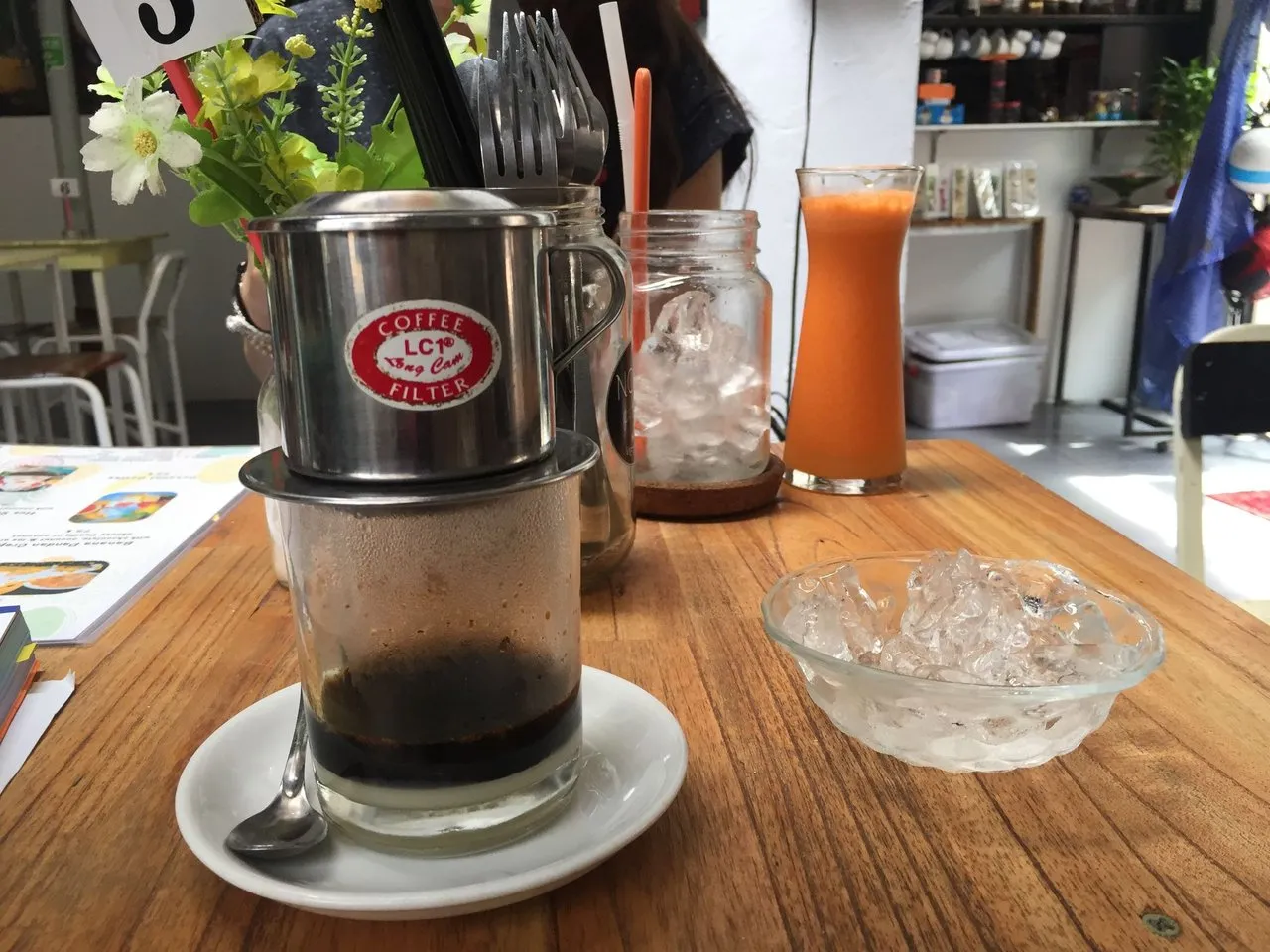 (Viet Filter Coffee 32,000vnd->1400원정도~ 역시 너무 싸죠~ 아이스로 마실수도 있게 따로 얼음을 담아주셨습니다.)