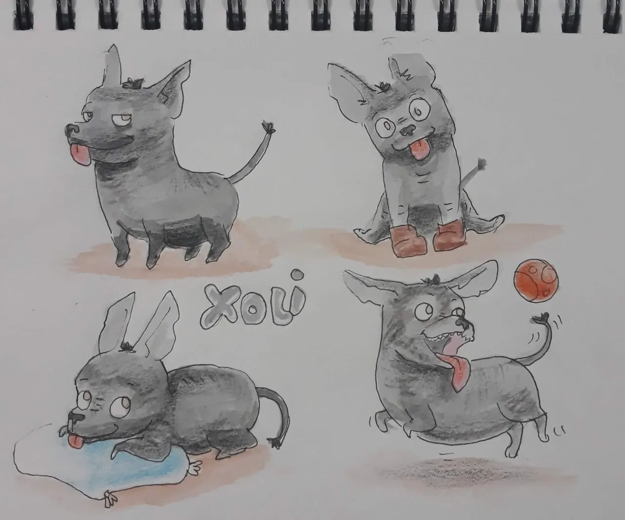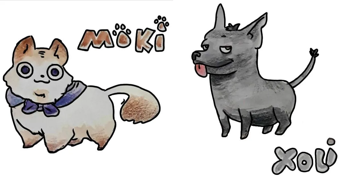 Estas ilustraciones las hice con dos propósitos. Uno es practicar el dibujo de animales que es algo que casi no hago, el otro es crear personajes originales que se puedan usar en historias o cuentos cortos. Hice a Moki porque me gustan mucho los gatos y Xoli está inspirado en los Xoloescuincles que son perros mexicanos muy peculiares, no tienen pelo salvo uno cuantos pelitos en la cabeza y en la cola. Xoli también está inspirado o influenciado en una perrita de raza Chihuaha que tuve llamada Suzu Yukiko que se me perdió hace unos años, pronto subiré otra ilustración de un Chihuahua en la que estoy trabajando.