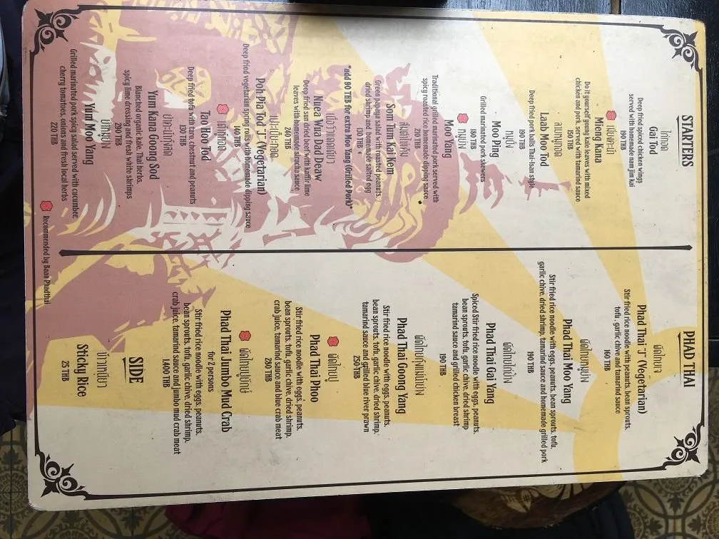 일단은 이 집의 메뉴중에 가장 유명한 팓 타이째고기종류를 넣지않은 팓타이입니다. 를 주문합니다. 팓타이는 태국을 방문하는 어떤 종류의 방문자들 모두가 한 번은 체험을 원합니다. 길거리의 팓타이부터 고급 태국 식당의 팓타이중에 어떤 것이라도 상관없으니 먹어보고자 합니다. 카오산거리의 길거리에서 가장 많이 판매하는 음식이 팓타이입니다.