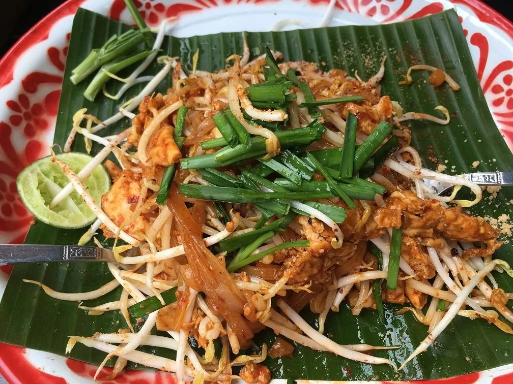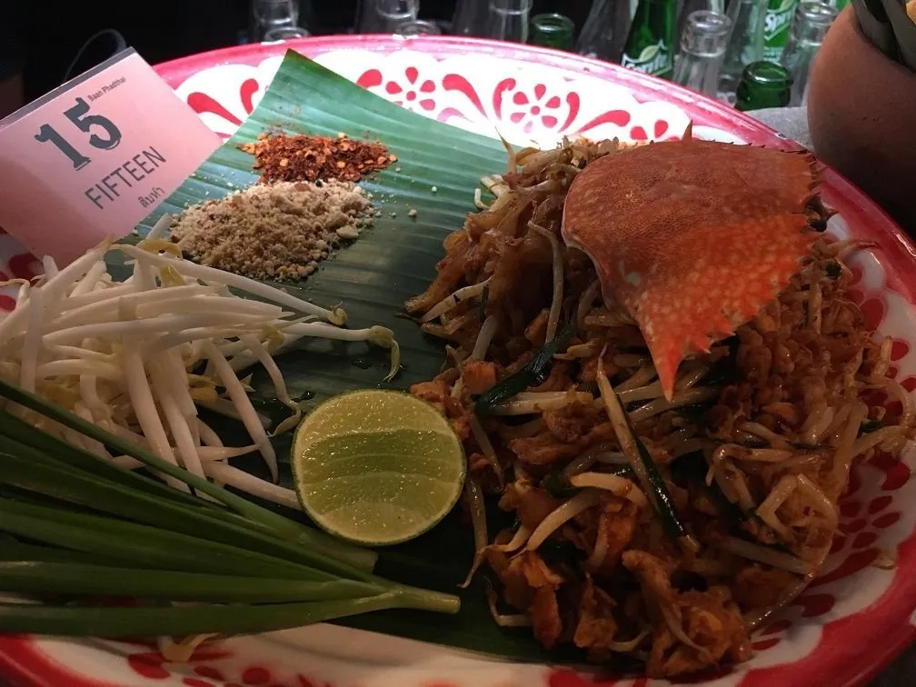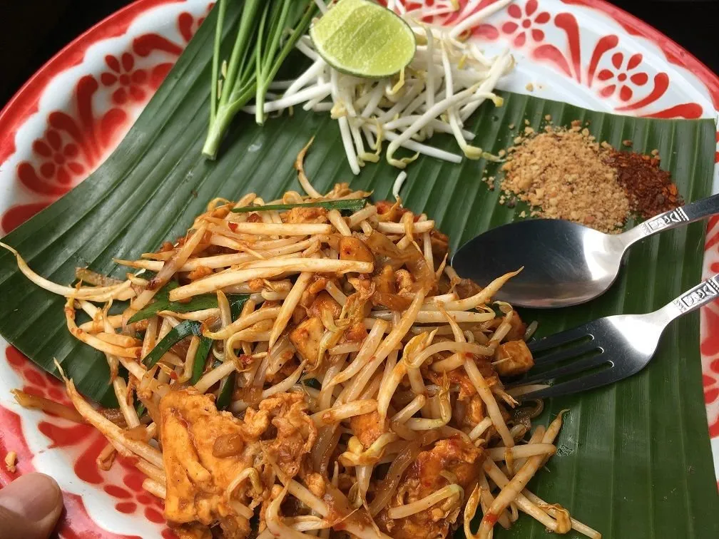 - 주문한 팓타이가 나옵니다. 오래된 양식의 법랑을 본딴 쟁반에 바나나잎을 깔고 서빙이 됩니다. 팓타이의 기본은 조금 달콤합니다. 개인의 호불호에 따라 양념을 추가합니다. 땅콩가루,레몬,매운고추가루,설탕,간장 등을 추가합니다. 간혹 생으로 나온 숙주나물을 못먹는 사람들이 있습니다. 다만, 모든것을 섞기전에 생 부추와 생 숙주의 맛을 보고 섞어야 합니다. 우리나라의 숙주와는 차이가 많습니다.우리것보다는 날것의 냄새가 덜합니다.