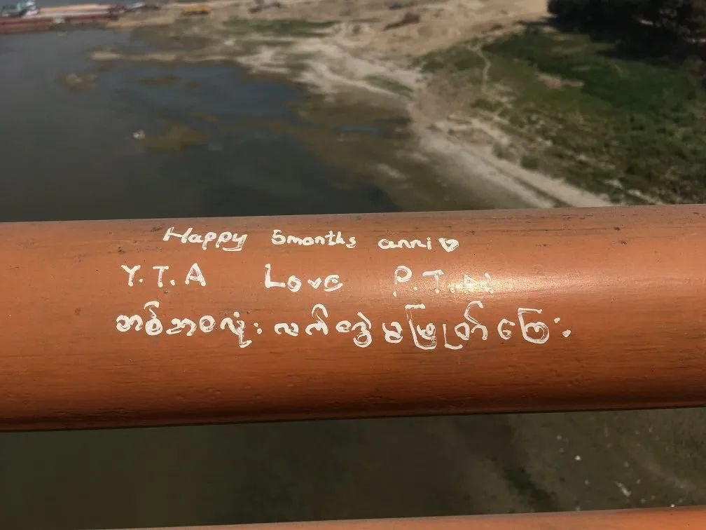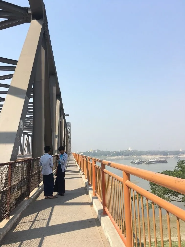 - 이라와디 강을 건너는 교각입니다. 히마판을 차에서 내려서 도보로 건너갑니다. 큰 실수였습니다. 상당히 긴 다리로 영국군이 지은 오래된 다리와 현재의 다리 두개가 이용되고있습니다. 도보로 건너는 이유는 간 건너의 산자락에 군집을 이루고 있는 사가잉 지역의 불탑군을 보기 위함이었습니다.