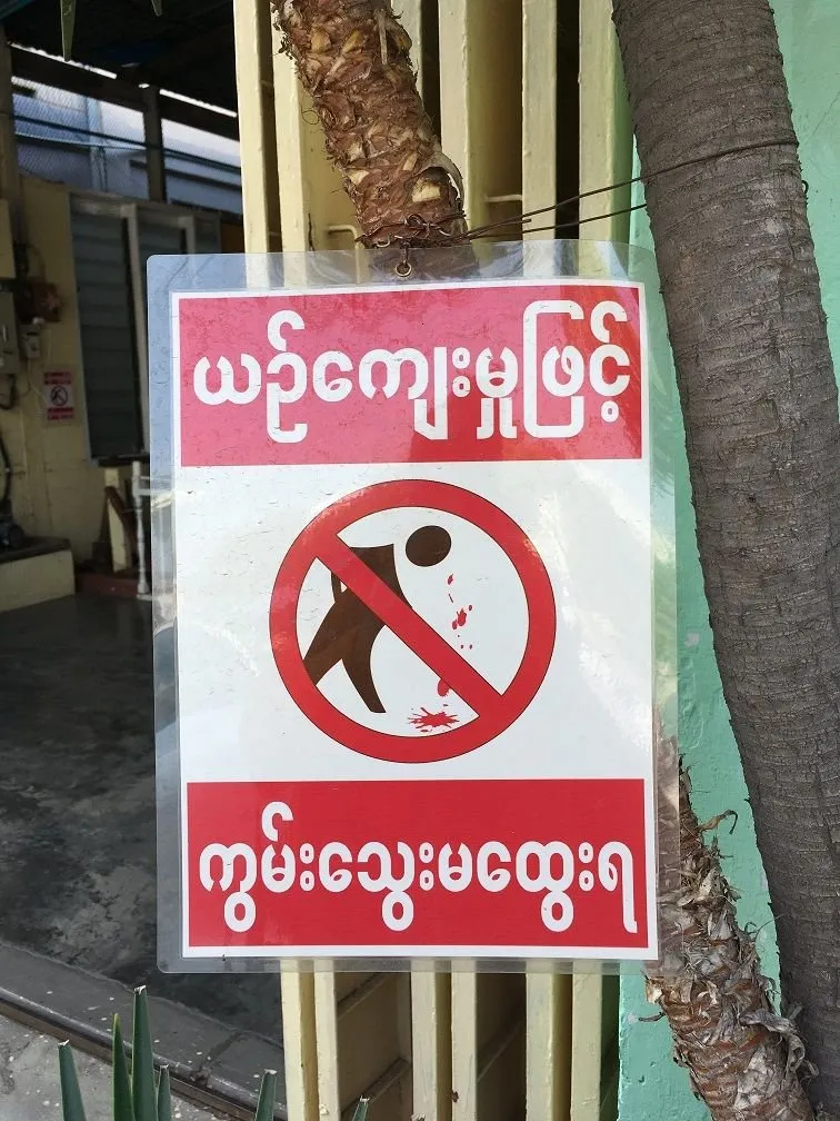 씹는 담배 종류를 즐길시에 입에 고인 벌건 침을 뱉지 말라는 뜻입니다. 길거리에 벌건 핏 자국이 많이 있습니다. 놀라지 마십시요.