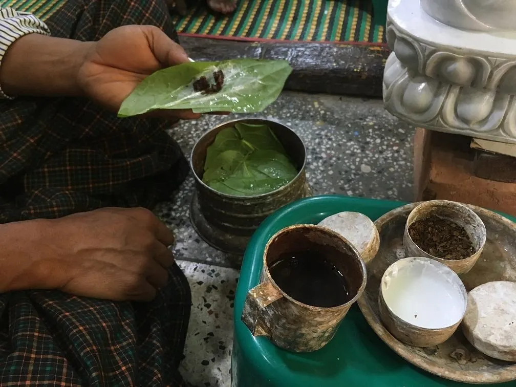 - 어느 사원의 입구에서 한 분이 씹는 담배 종류를 만들고 계십니다. 저 잎사귀 쇠퇴같이 씁니다. 우리가 하면 어지럽고 속이 뒤집어 진다고 합니다. 권한다고 하면 안됩니다.