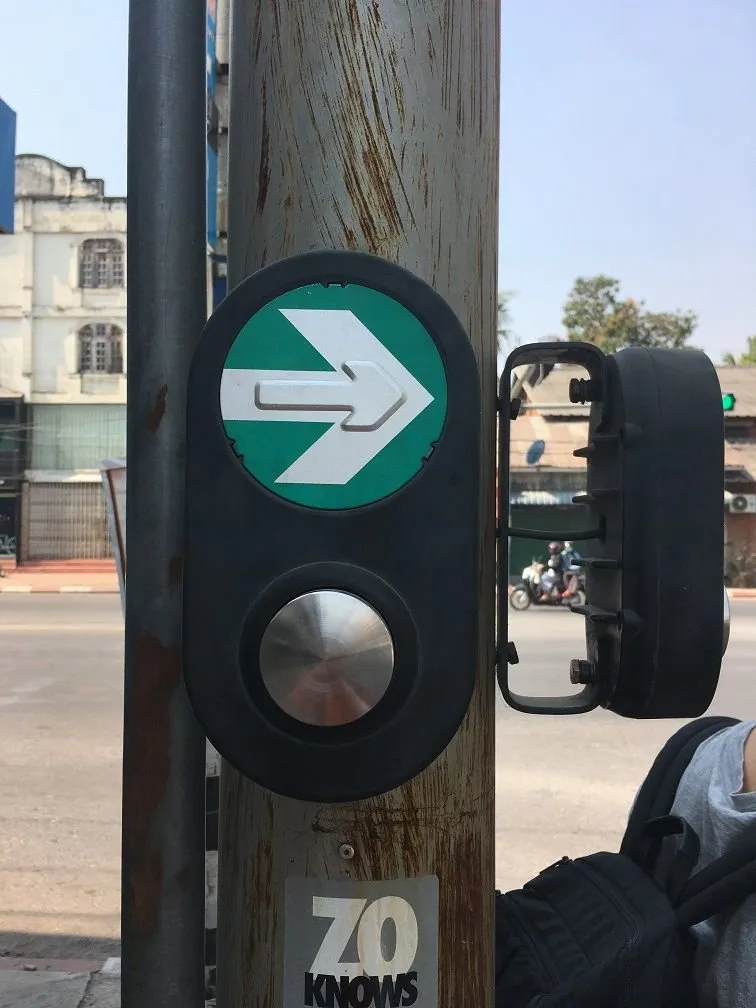 오래전에 한국도 이런 신호등을 설치한적이 있었습니다. 무작정 기다려도 횡단보도 신호가안바뀝니다. 신호등 기둥에 달린 버튼을 눌러야 합니다.