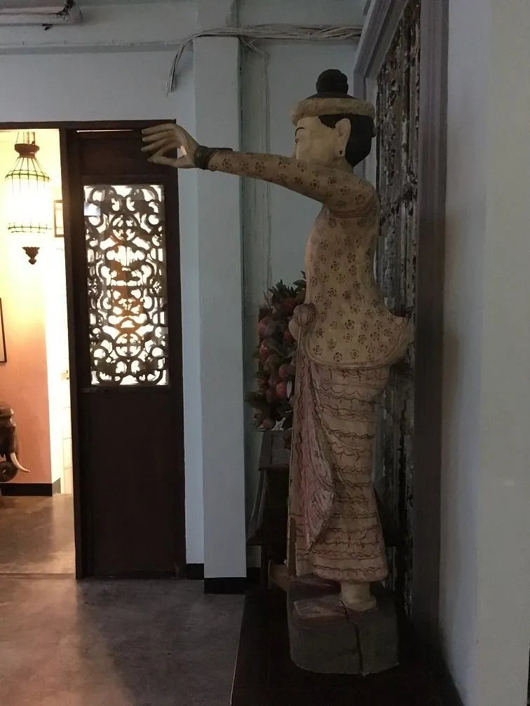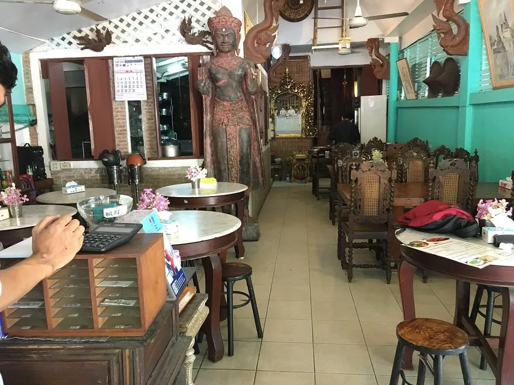 - 메인홀은 바쁜시간이 지나서 그런지 한가합니다. 오후 3시경입니다. 가게 안쪽에 세워져 있는 형상이 눈에 뜨입니다. 아마도 앙코르 유적지에서 본딴 형상인듯합니다. 바야바르만의 미소 같기도 하구요.
