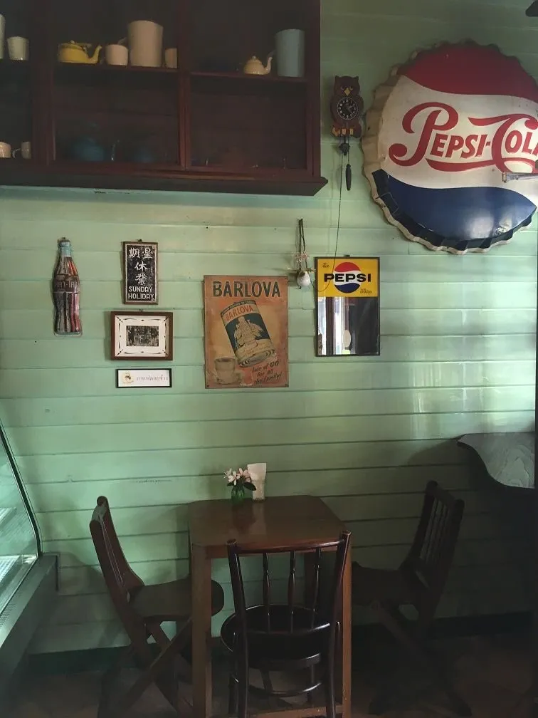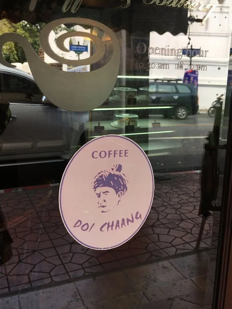 - 문에 붙어있는 스티커를 보고 이집의 커피를 알아챕니다. 태국에서 유명하고 많은 애호가를 보유한 "도이창 커피"입니다. 맛이 강하고 향이 좋지요.