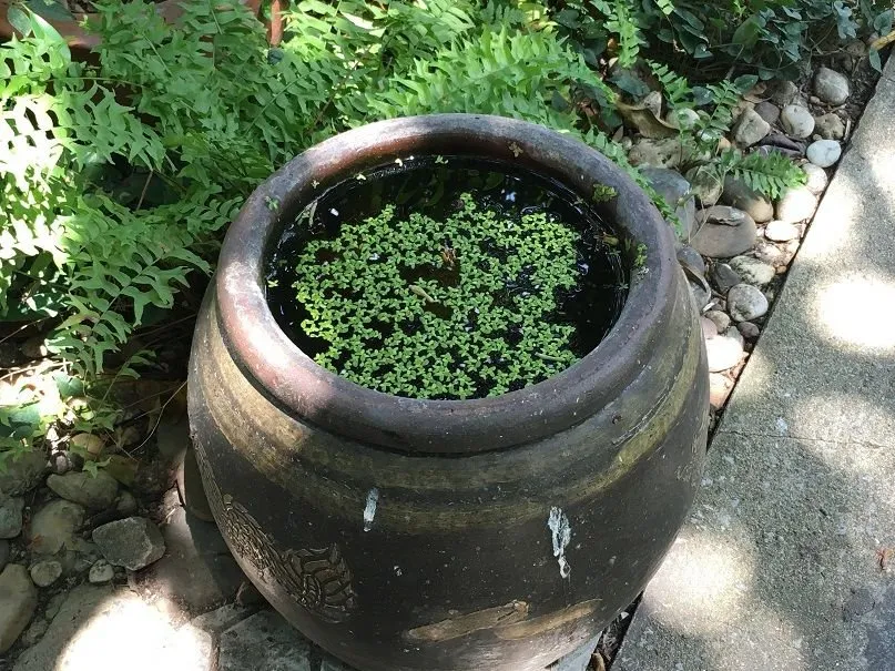 - 정원에 놓여진 항아리에는 물풀이 떠있고 작은 물고기들이 돌고 있습니다. 태국 정원의 일상적인 모습입니다.