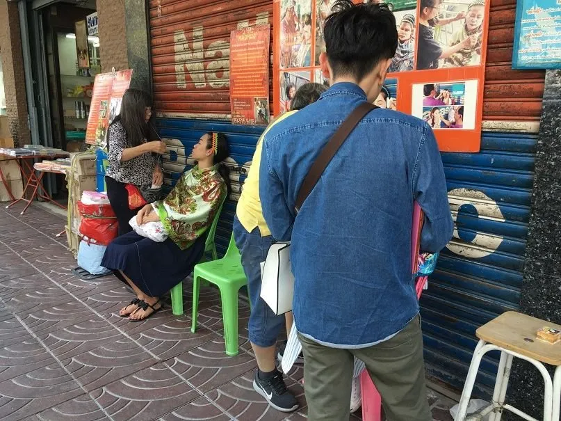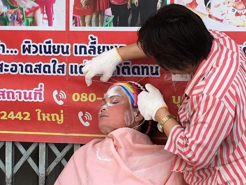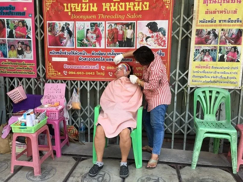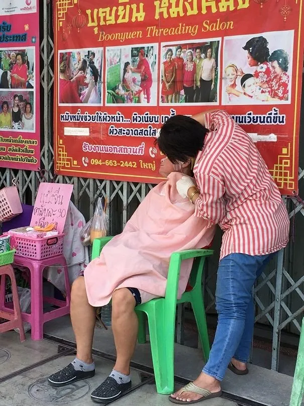 고대 인도에서 시작되어 중동 지역을 거쳐서 아시아 전역에 걸쳐서 애용?이 되다가 이제는 전세계로 확산되어 사용하는 고대 제모 방법입니다. 주로 얼굴에 시술?이되는 이 방법을 차이나타운의 거리의 한 도로변에서 시술을 하여 도로가 유명하여 진 곳이 있습니다. 이 곳은 차이나 타운 거리의 짜런꿍 Chroen Krung거리의 100여 미터 사이에 늘어서서 영업을 합니다.