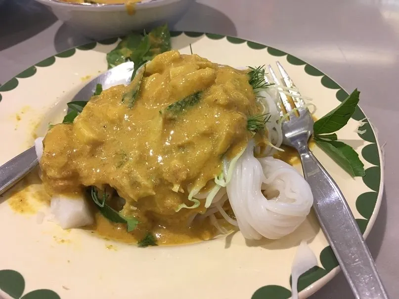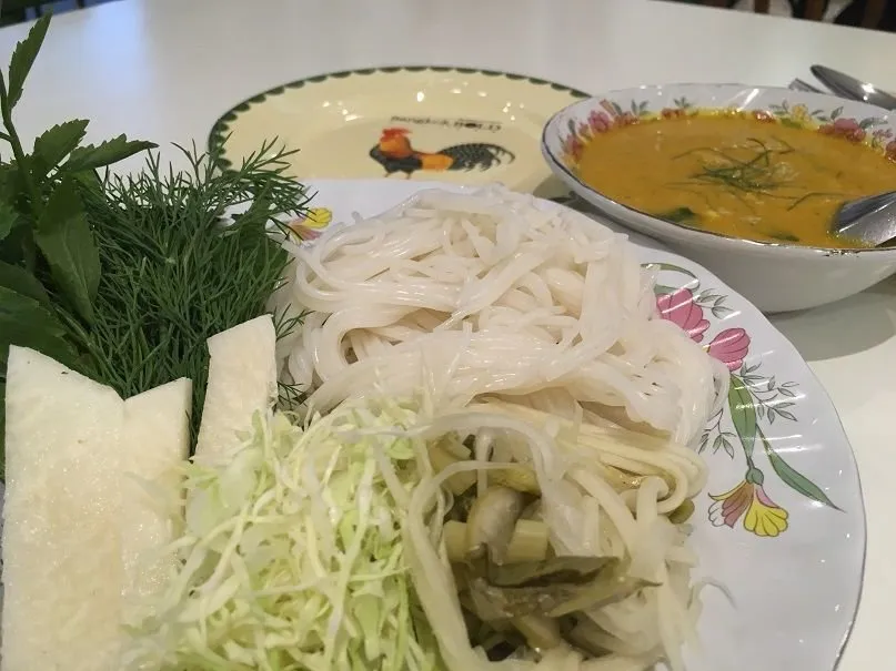 "카놈 찐"입니다. 발효 생선 국물과 부드럽게 삶은 달걀에 구운 돼지 고기와 버섯이 들어간 수프에 국수와 야채와 같이 먹는 겁니다.