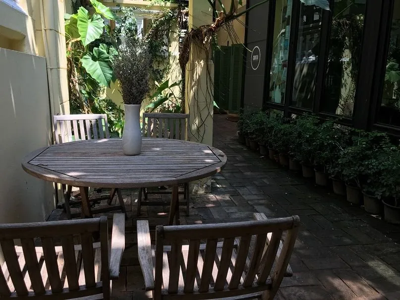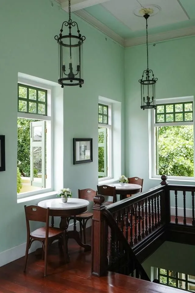 - 정원으로 들어가면 카페와 리셉션이 운용되는 작은 공간이 있습니다. 이곳에서 체크인을 하고 외부 손님들이 이 호텔을 보기위하여 필수로 이 공간을 통화하고 호텔의 주변을 구경합니다. 카페는 뒤쪽에 또 다른 공간을 제공합니다. 메인 카페같은 공간이 뒤쪽에 따로 있습니다.