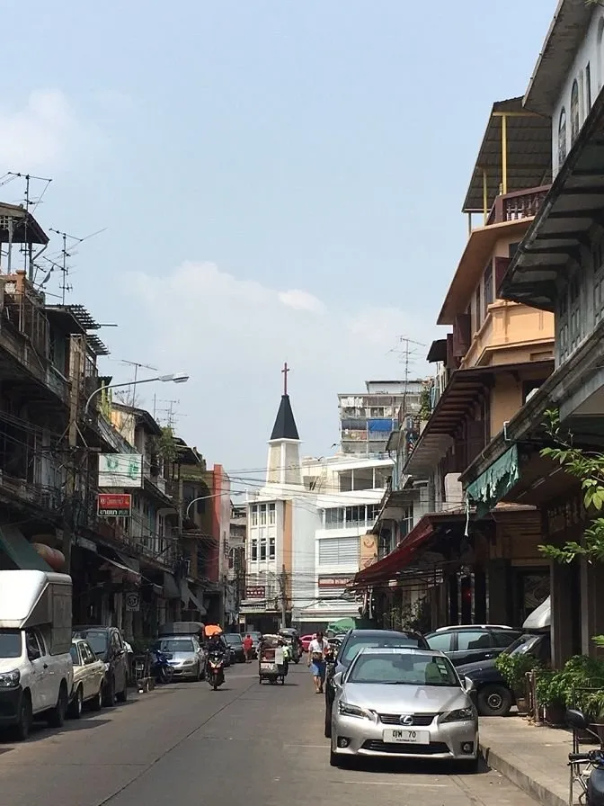 - 가게는 한약재 상이 주로 모여 있는 이 거리의 중간에 있습니다. 방콕에서 보기 힘든 교회가 골목 끝을 넘어서 보입니다.