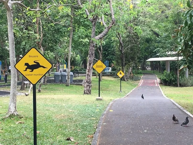 - 물 왕도마뱀을 조심하랍니다. 곳곳에 경고판이 있습니다. 물 왕도마뱀이 많은가 봅니다.