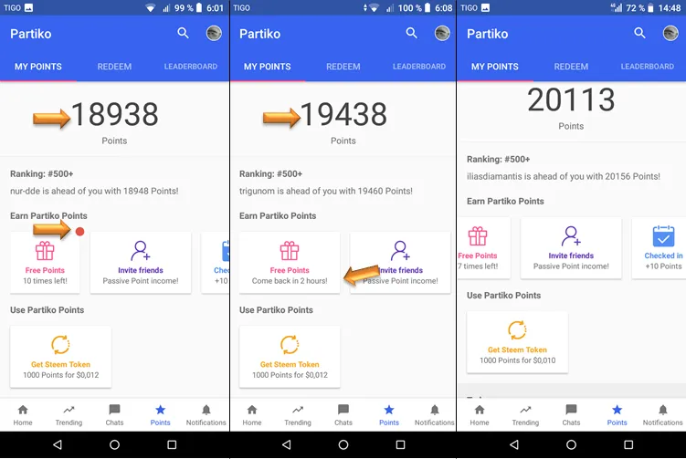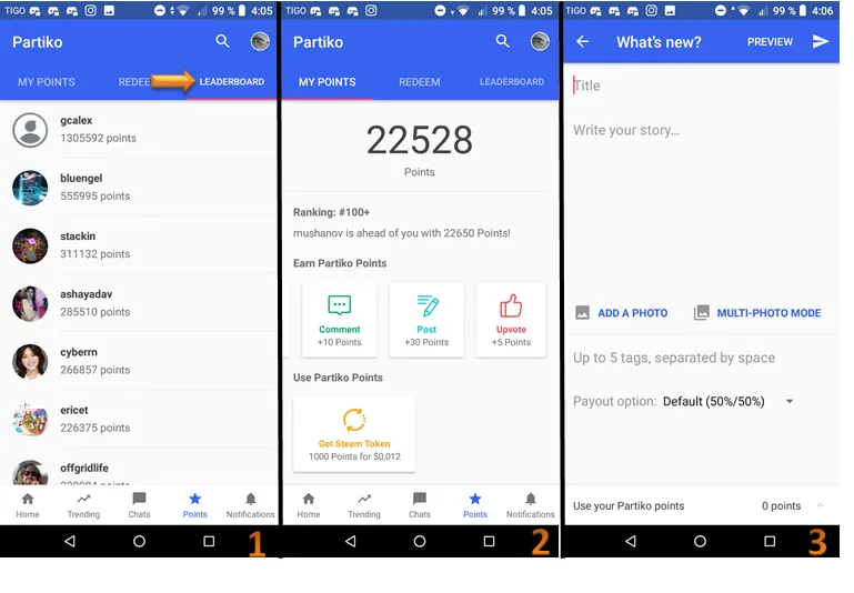 Already at number 3 you can see how the application is presented to you when you want to make a publication, it is very easy to understand and manage, at the bottom of that my image can be seen that says * use tour partiko points *, at the moment of publish you can select the amount of points you want to use to promote your publication.