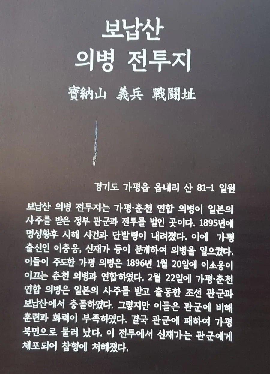 보납산 의병 전투지는 가평· 춘천 연합 의병이 일본의 사주를 받은 정부 관군과 전투를 벌인 곳이다. 1895년에 명성황후 시해 사건과 단발령이 내려졌다. 이에 가평 출신인 이충용, 신재개 등이 분개하여 의병을 일으켰다. 이들이 주도한 가평의병은 1896년 1월 20일에 이소응이 이끄는 춘천 의병과 연합하였다. 2월 22일에 가평·춘천 연합 의병은 일본의 사주를 받고 출동한 조선 관군과 보납산에서 충돌하였다. 그렇지만 이들은 관군에 비해 훈련과 화력이 부족하였다 . 결국 관군에 패하여 가평 북면으로 물러 났다. 이 전투에서 신재가는 관군에게 체포되어 참형에 처해졌다.