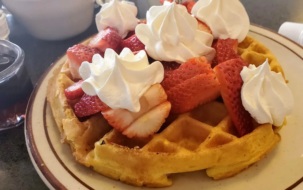 They are also known for their perfectly fluffy, light waffles and pancakes. Typically topped with whipped cream and strawberries.