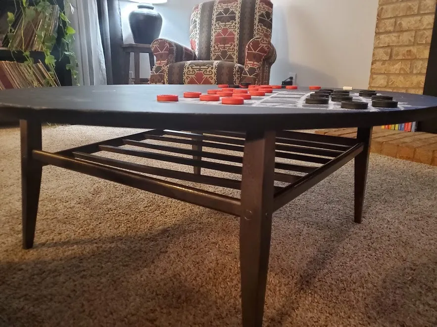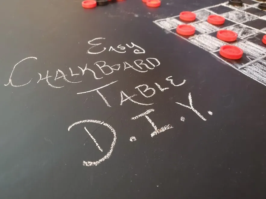 Because it was laminate, I didn't have to sand the top to acquire the smooth surface required for chalkboard paint. I simply spray painted the legs with a metallic paint, then applied two coats to the top and edges. After allowing it to dry for a full 24 hours, we brought it inside and quickly began using it as a checker board.
