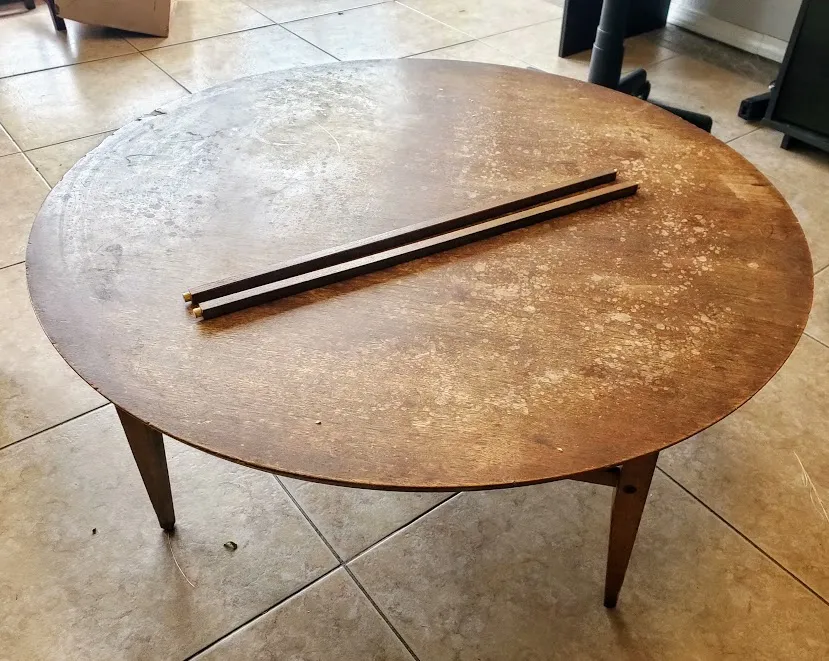 We have this wonderfully classic and beautifully shaped coffee table, that I have refused to part with, despite its all around shabbiness and the fact that it is slowly falling apart. We lugged it across the country, not doing it any favors, and relegated it to the kid's room, sometimes pulled out and used as a kid's table during family gatherings.