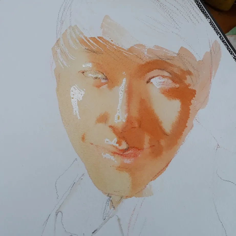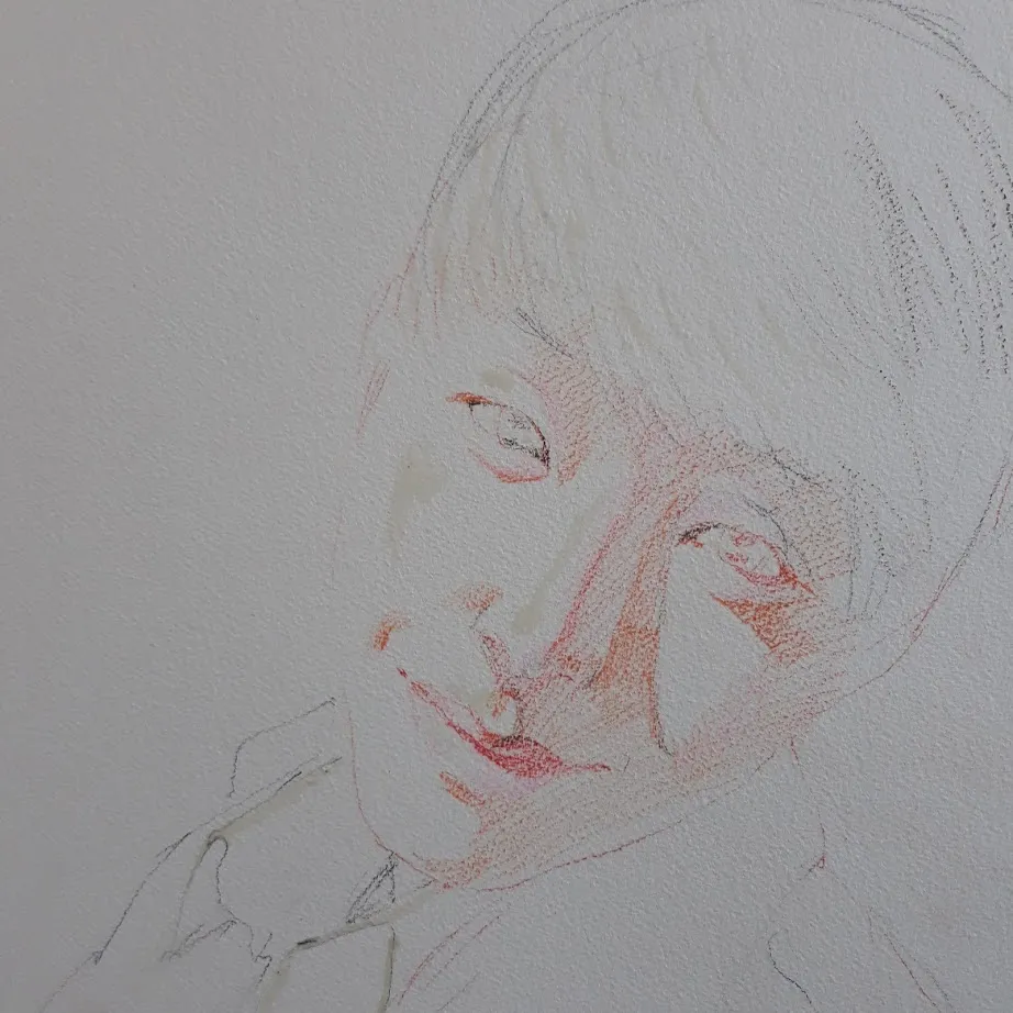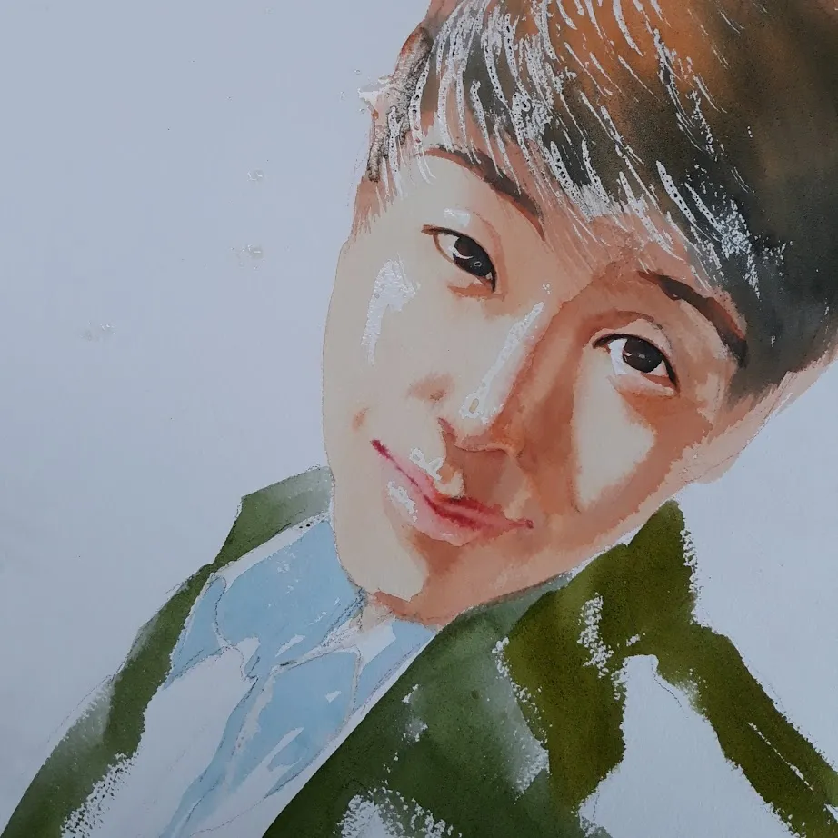 1 .일단 수채용 색연필로 드로잉 후, 마스킹액으로 콧날과, 눈동자, 이마, 머리털에 화이트 포인트, 그리고 밝은 색으로 한 번 전체 붓질해서 수채 색연필을 녹입니다.