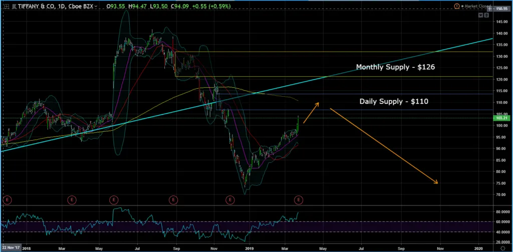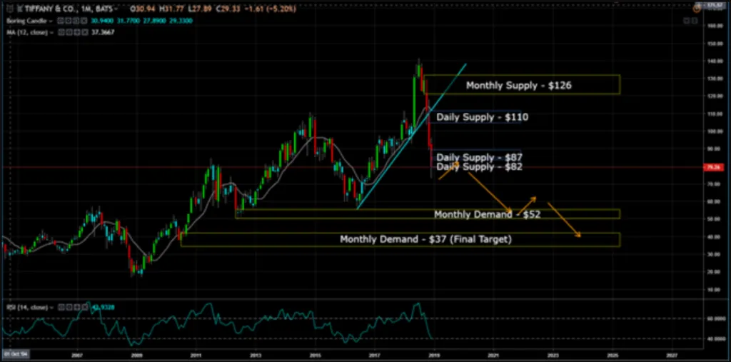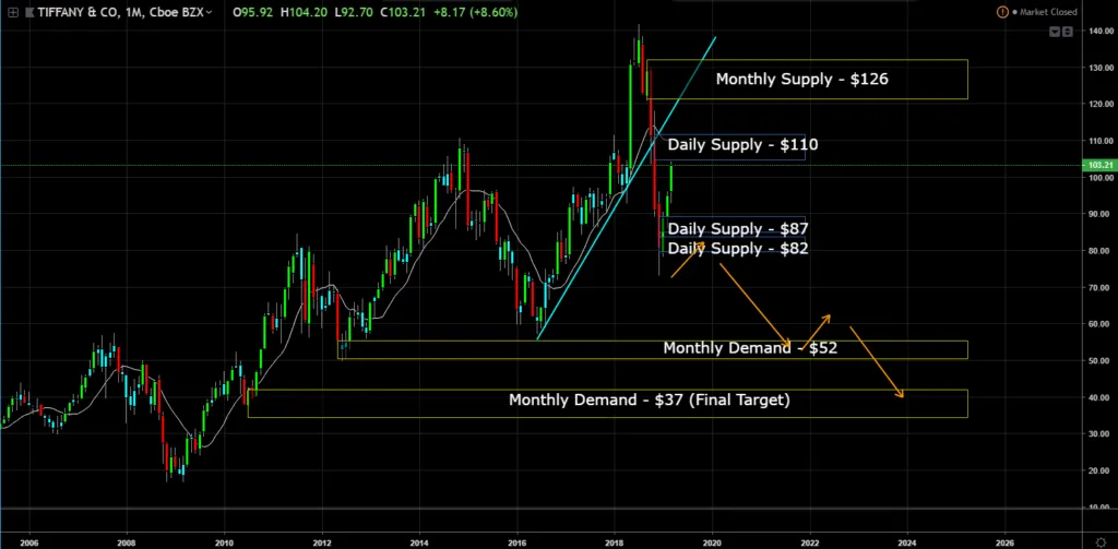 Last week, Tiffany stock price broke though the daily supply at $82. This level now becomes resistance. As price breaks the $82 level, it formed another daily supply at $87. The chart suggests there is further downside risk. Next target is $52 and my final target is $37.