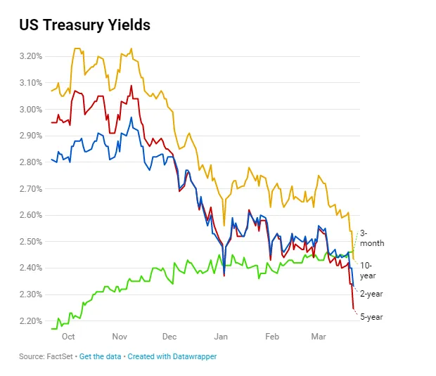 Also, Fed Powell left interest rates unchanged this past week, signaling that the US economy isn’t as strong as people thinks. And for the first time since 2007, the three month bill vs. the 10 year note inverted. On Friday, the 10-year note yield fell nearly 10 basis points to 2.434%, while the 3-month bill was down a single basis point to 2.462%.