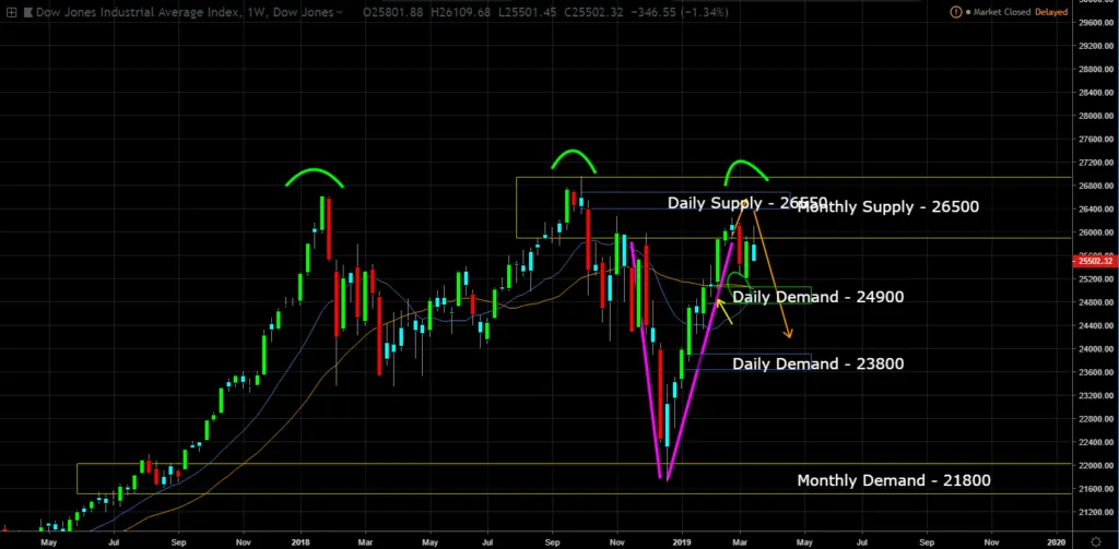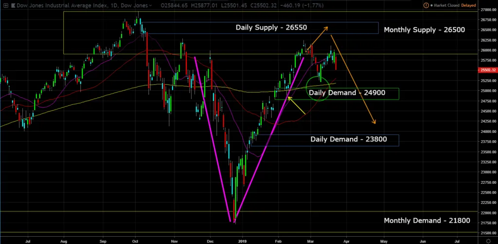 When you throw these two ingredients into a pot and mix them up, you get a Dow Jones industrial average closed down 460.19 points, or about 1.8%, to 25,502. The daily demand at 24900 is still in play,