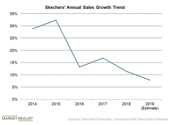 Despite Skechers’s sales growing 11.5% to $4.6 billion in 2018 and opening 25 company-owned domestic stores and 26 company-owned international stores in 2018, their annual sales growth continues to decelerate.