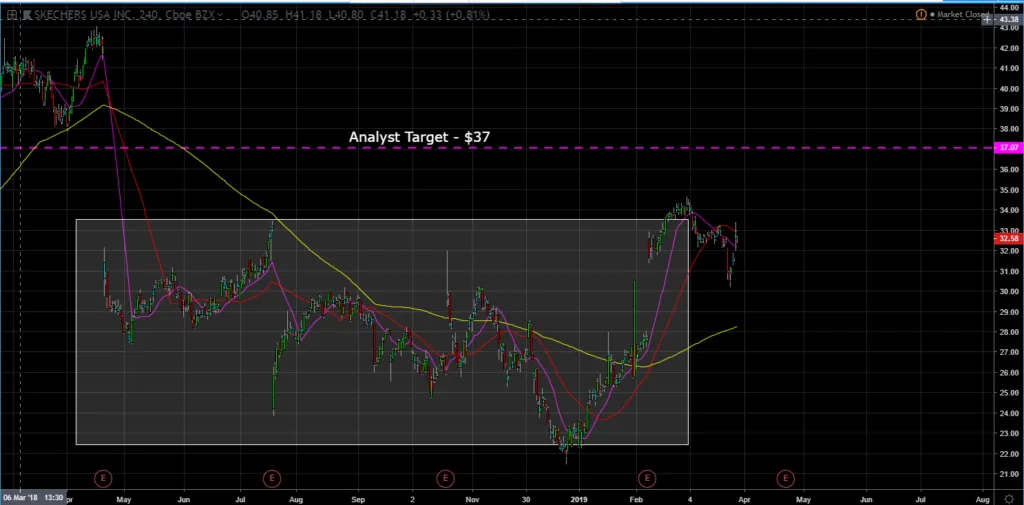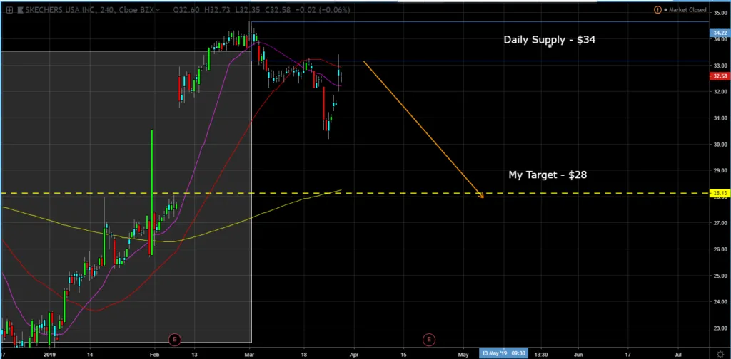 So, although Skechers got upgrade and although the price rose 3% on the news, it was actually an opportunity to short the stock as suggested by the daily supply at $34 with a price target at the gap fill at $28.