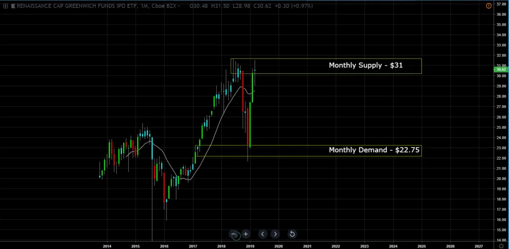 The chart suggests if price breaks the Monthly Supply at $31 to the upside, to buy on the pull back.