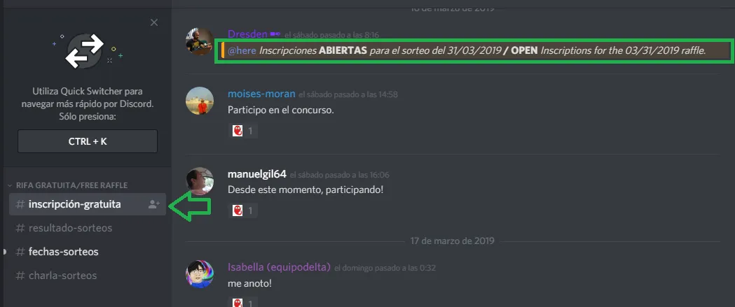 2. Busca el canal "inscripción gratuita" en la sección Rifa gratuita -Free raffle y apúntate.