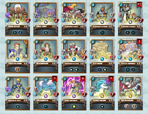Pero, ¿cuál es tu mazo más fuerte, Salvao?. Pues a ver, a ver... yo diría que el blanco. Mi siguiente paso va a ser subirlas a los niveles respectivos del invocador que tengo a seis (comunes 8; raras 6; épicas 5); digamos con el 30% de los beneficios que vaya obteniendo en los torneos de SteemMonsters y diariamente también en DrugsWar. Veremos qué tan lejos puedo llegar con esas cartas, tal vez, con suerte y muchas partidas me acerque de nuevo a las divisiones Champions.