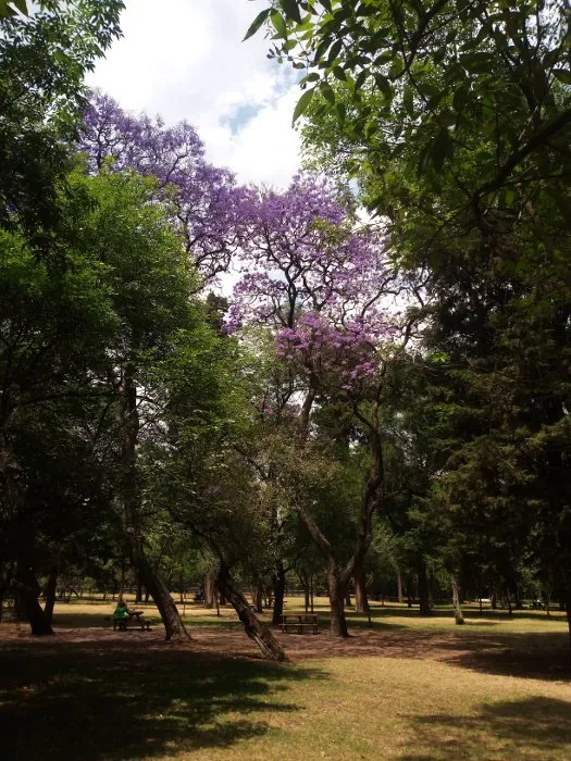 For seeing more trees, Jacarandas and others, one has to go to the Bosque de Chapultepec. The name literally means "Grasshopper-hill Forest", but the place is nothing like an actual forest. It's much rather a city park. Similarly, the nearest actual forest, outside the city to the west, is called Desierto de los Leones meaning "Loins' Desert" though it is not a desert, and it doesn't have any lions in it.